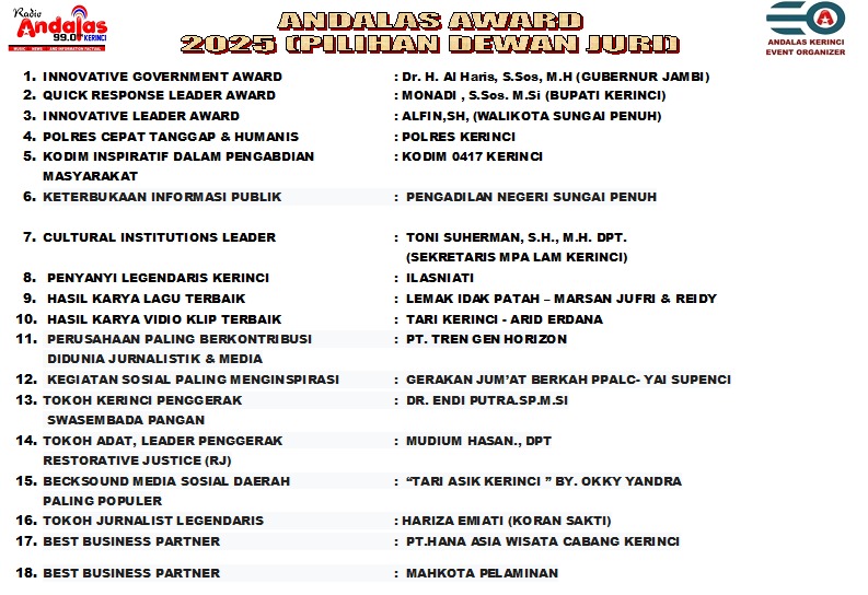 Dewan juri Andalas Award 2025 telah menyeleksi sejumlah tokoh dan lembaga dengan mempertimbangkan aspek kinerja, inovasi, dedikasi, serta kontribusi sosial sepanjang tahun.