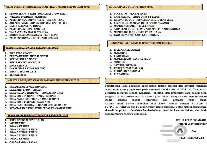 📌 Andalas Award: Simbol Apresiasi, Inspirasi, dan Kolaborasi Lebih dari sekadar ajang penghargaan, Andalas Award 2025 menjadi simbol kolaborasi antara pemerintah, media, pelaku budaya, dan masyarakat. Melalui penghargaan ini, Media Andalas Group berharap dapat terus menumbuhkan semangat berprestasi, memperkuat karakter daerah, serta menginspirasi generasi muda untuk terus berkarya bagi Bhumi Sakti Alam Kerinci dan Provinsi Jambi.