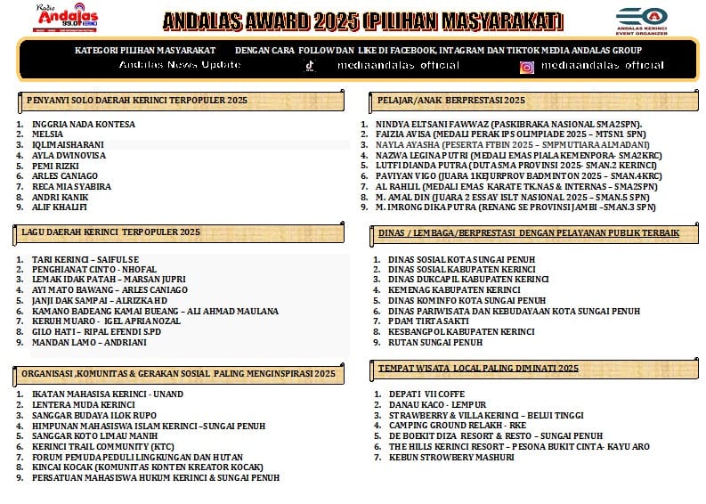Masyarakat juga diberi kesempatan untuk turut berpartisipasi dalam kategori “Pilihan Masyarakat 2025” melalui akun media sosial resmi Media Andalas Group: