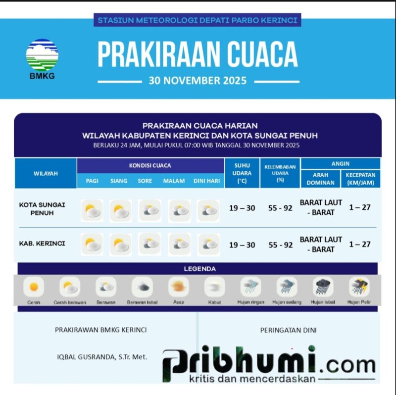 Kerinci, Pribhumi.com — Stasiun Meteorologi Depati Parbo Kerinci kembali menerbitkan laporan prakiraan cuaca harian untuk wilayah Kabupaten Kerinci dan Kota Sungai Penuh yang berlaku selama 24 jam mulai Minggu (30/11/2025) pukul 07.00 WIB. Dalam hasil pengamatan yang disampaikan oleh prakirawan BMKG, Iqbal Gusranda, S.Tr. Met., kedua daerah tersebut diperkirakan berada dalam kondisi cuaca yang relatif tenang tanpa adanya tanda-tanda gangguan atmosfer yang berarti.