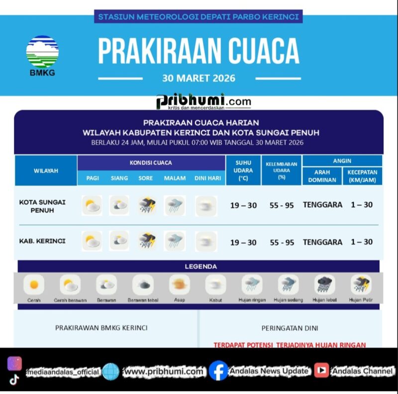KERINCI, Pribhumi.com – Stasiun Meteorologi Depati Parbo Kerinci merilis prakiraan cuaca terbaru untuk wilayah Kabupaten Kerinci dan Kota Sungai Penuh pada Senin, 30 Maret 2026. Masyarakat dihimbau untuk waspada terhadap potensi cuaca ekstrem yang diperkirakan terjadi pada sore hari.