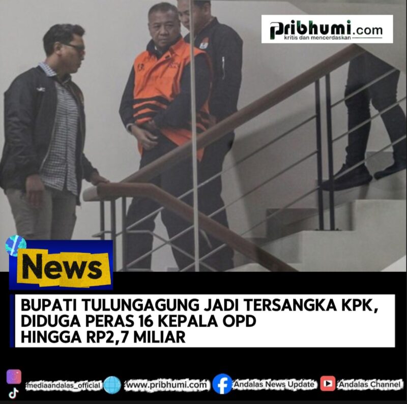 TULUNGAGUNG, Pribhumi.com – Komisi Pemberantasan Korupsi (KPK) resmi menetapkan Bupati Tulungagung, Gatut Sunu Wibowo (GSW), sebagai tersangka dalam kasus dugaan pemerasan terhadap pejabat di lingkungan pemerintah daerah. Ia diduga meminta sejumlah uang kepada 16 Kepala Organisasi Perangkat Daerah (OPD).