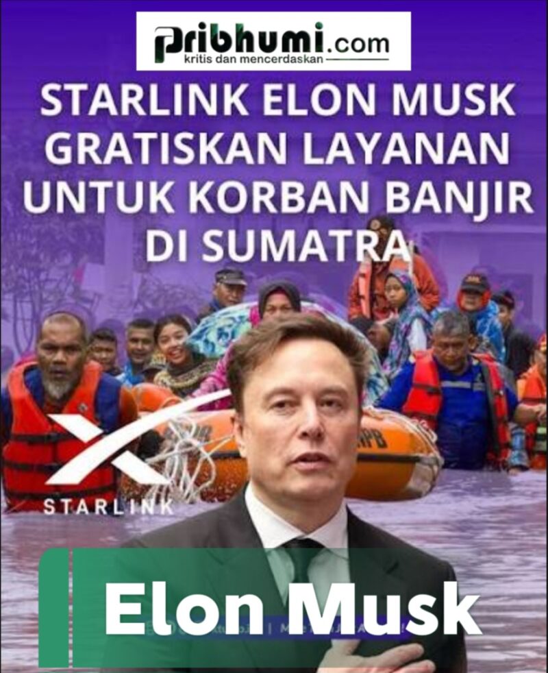 Pribhumi.com  — CEO SpaceX sekaligus pendiri Starlink, Elon Musk, mengumumkan kebijakan bantuan darurat berupa layanan internet satelit Starlink gratis untuk masyarakat di wilayah Sumatera yang terdampak banjir besar. Pengumuman tersebut disampaikan melalui platform X, di mana Starlink memastikan bahwa program bantuan berlaku hingga akhir Desember 2025.