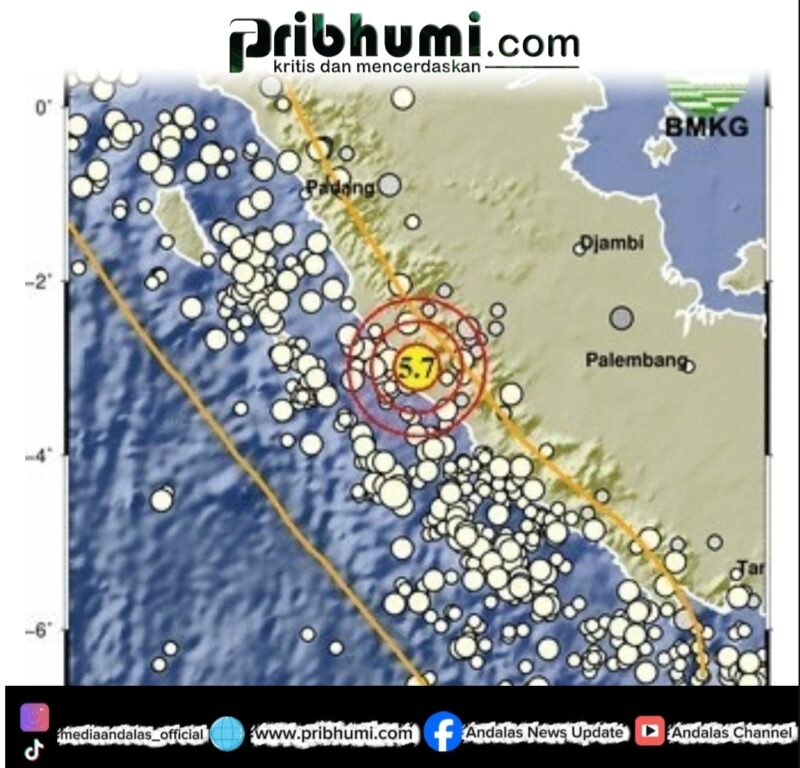 Lebong, Pribhumi.com – Gempa bumi berkekuatan magnitudo 5,7 mengguncang wilayah Kabupaten Lebong, Provinsi Bengkulu, pada Jumat malam (7/3/2026) menjelang tengah malam.
