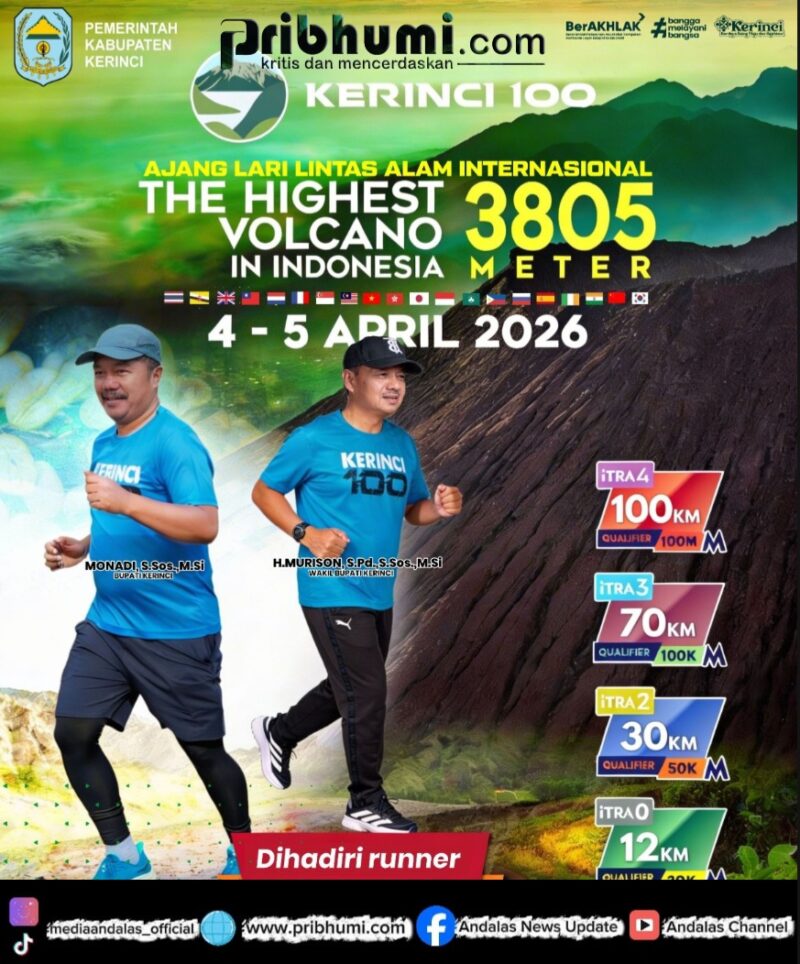 KERINCI, Pribhumi.com – Pemerintah Kabupaten Kerinci secara resmi mengumumkan penyelenggaraan ajang lari lintas alam (trail running) berskala internasional bertajuk “Kerinci 100”. Perhelatan bergengsi ini dijadwalkan berlangsung pada 4 – 5 April 2026, bertempat di kawasan Gunung Kerinci, gunung berapi tertinggi di Indonesia dengan ketinggian 3.805 meter di atas permukaan laut.