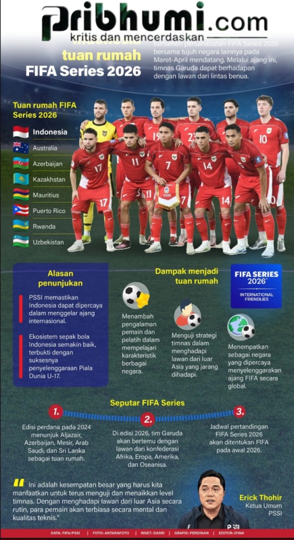 Jakarta, Pribhumi.com — Indonesia telah ditunjuk oleh FIFA untuk menjadi tuan rumah bagi turnamen persahabatan FIFA Series pada tahun 2026. Turnamen ini dijadwalkan akan berlangsung pada periode Maret-April 2026.