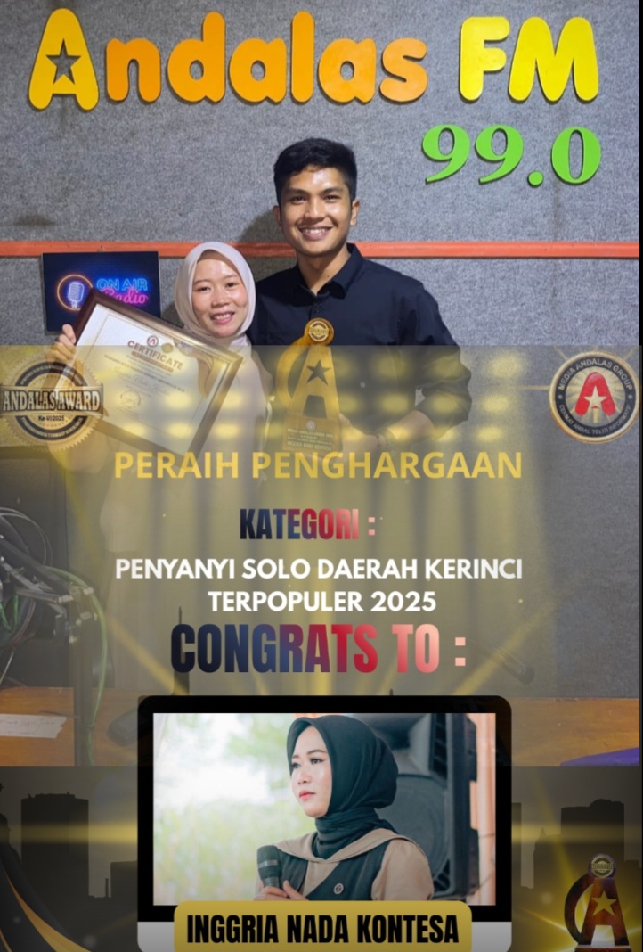 Penghargaan tersebut diumumkan secara resmi dalam malam puncak Andalas Award yang digelar dengan meriah dan dihadiri oleh tokoh daerah, insan kreatif, serta komunitas musik Kerinci-Sungai Penuh. Sosok Inggria Nada Kontesa dinilai layak menerima penghargaan ini berkat konsistensinya menghadirkan karya bernuansa budaya lokal serta kemampuan vokal yang kuat dan memiliki ciri khas tersendiri.
