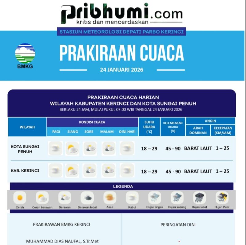 KERINCI, Pribhumi.com – Stasiun Meteorologi Depati Parbo Kerinci merilis prakiraan cuaca harian untuk wilayah Kabupaten Kerinci dan Kota Sungai Penuh yang berlaku selama 24 jam, mulai Sabtu, 24 Januari 2026 pukul 07.00 WIB.