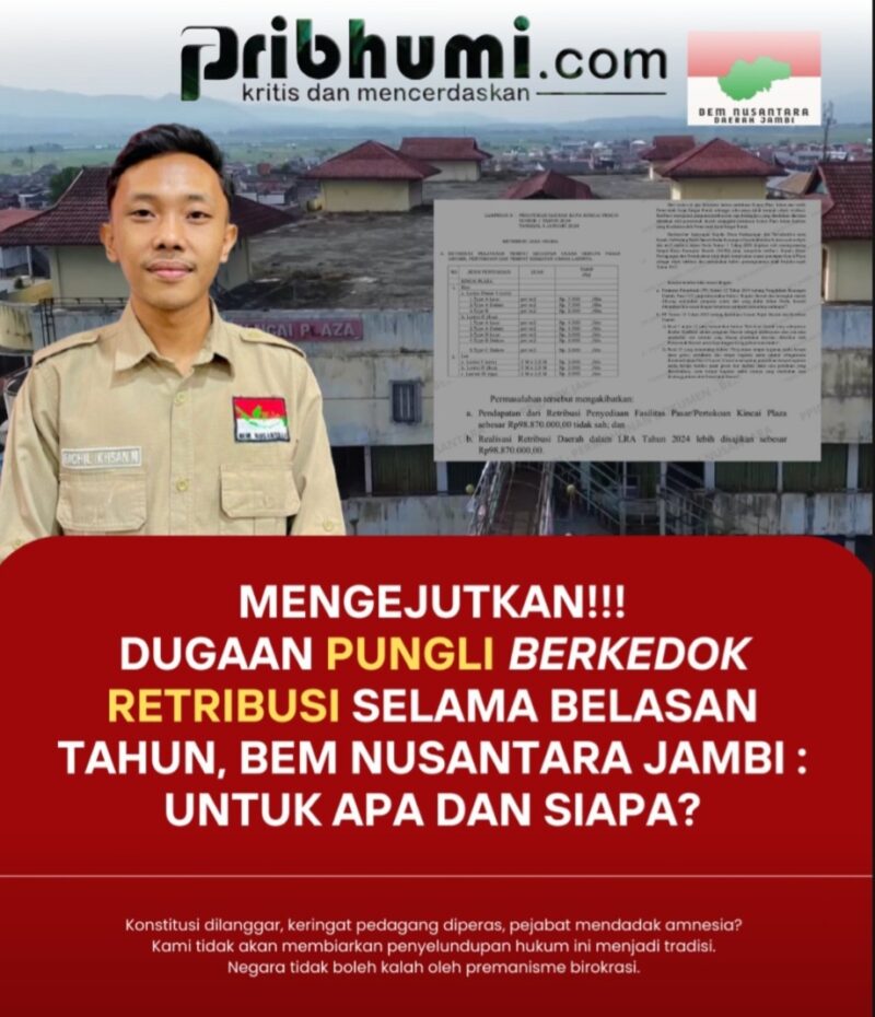 KERINCI – SUNGAI PENUH, 31 Desember 2025 Koordinator Daerah BEM Nusantara Jambi, Fadhil Ikhsan Mahendra, menabuh genderang perang terhadap praktik maladministrasi kronis di Kota Sungai Penuh. Berdasarkan hasil bedah LHP BPK RI, Fadhil mengendus adanya Anomali Administrasi Gila di mana Pemerintah Kota Sungai Penuh diduga kuat telah menguras keringat pedagang Kincai Plaza melalui pungutan ilegal selama belasan tahun.