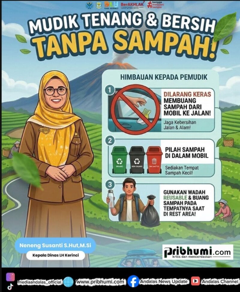 KERINCI, Pribhumi.com – Menyambut arus mudik tahun ini, Dinas Lingkungan Hidup (DLH) Kabupaten Kerinci meluncurkan kampanye bertajuk “Mudik Tenang & Bersih”. Program ini bertujuan mengajak masyarakat untuk tetap menjaga kebersihan lingkungan selama perjalanan mudik, terutama di kawasan pegunungan dan perkebunan teh yang menjadi ciri khas daerah tersebut.