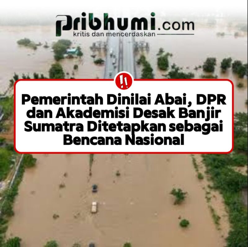Andalas, Pribhumi.com Pemerintah pusat hingga kini belum menetapkan bencana banjir dan tanah longsor yang melanda Sumatra Utara, Sumatra Barat, dan Aceh sebagai bencana nasional. Sikap tersebut menuai kritik dari berbagai pihak, mulai dari DPR RI, kepala daerah, hingga kalangan akademisi yang menilai dampak bencana telah melampaui kapasitas penanganan daerah.