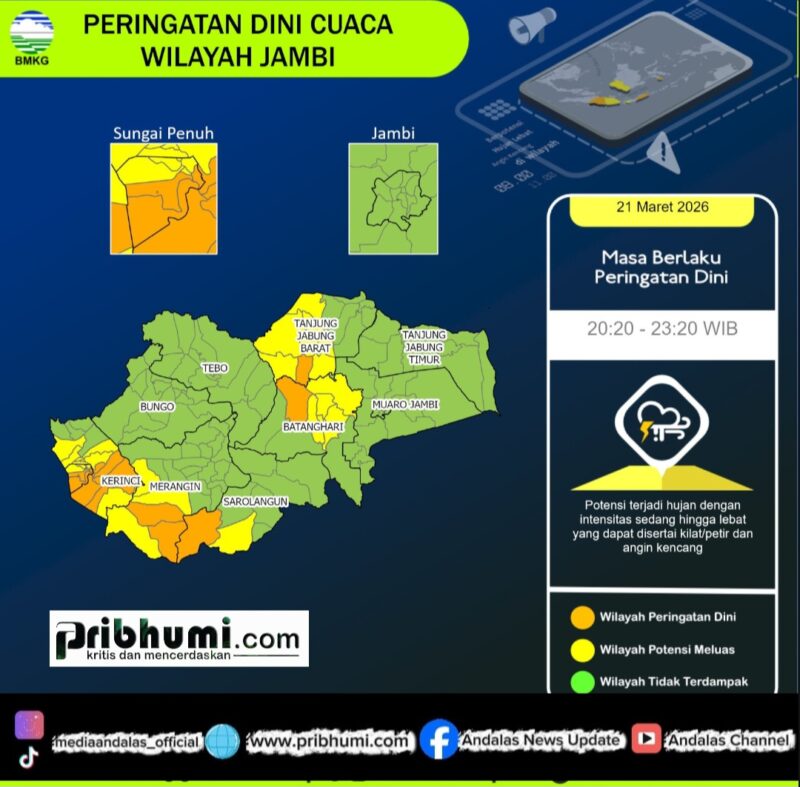 JAMBI, Pribhumi.com – Peringatan dini cuaca kembali dikeluarkan untuk wilayah Provinsi Jambi pada Sabtu, 21 Maret 2026 malam. Berdasarkan pembaruan pukul 20.10 WIB, sejumlah daerah berpotensi mengalami hujan dengan intensitas sedang hingga lebat yang dapat disertai kilat atau petir serta angin kencang.