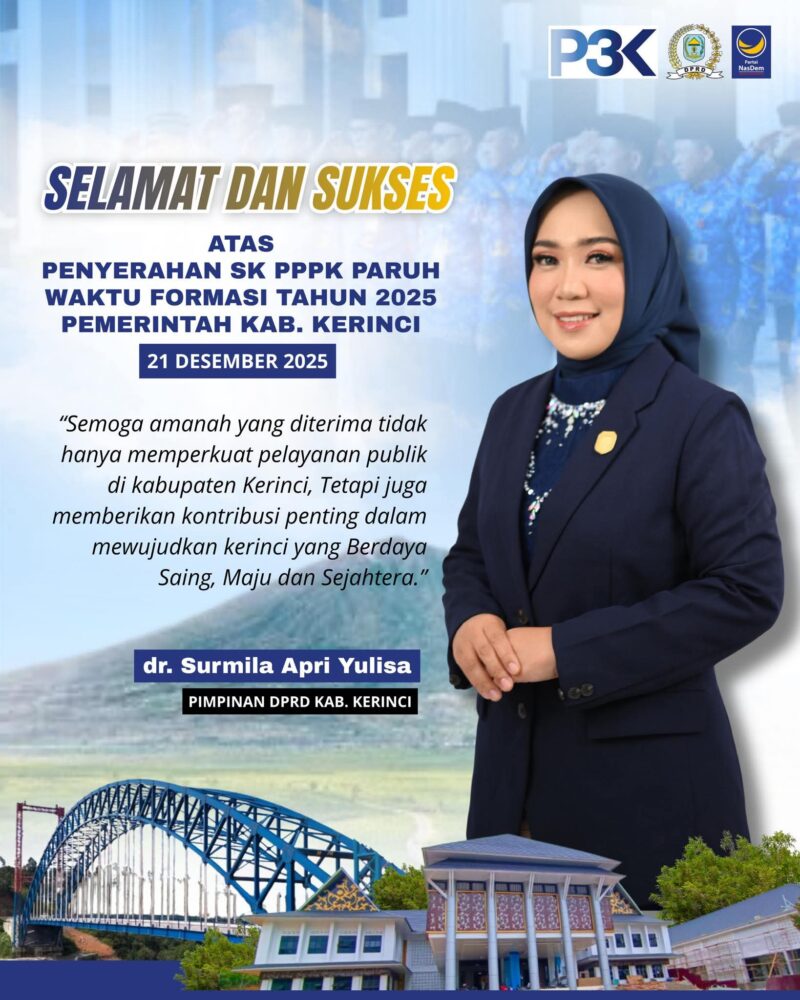 “Kehadiran PPPK Paruh Waktu diharapkan mampu memperkuat kinerja birokrasi dan meningkatkan kualitas pelayanan publik di Kabupaten Kerinci, baik di sektor pendidikan, kesehatan, maupun pelayanan administrasi pemerintahan,” ujar politisi Partai NasDem tersebut.