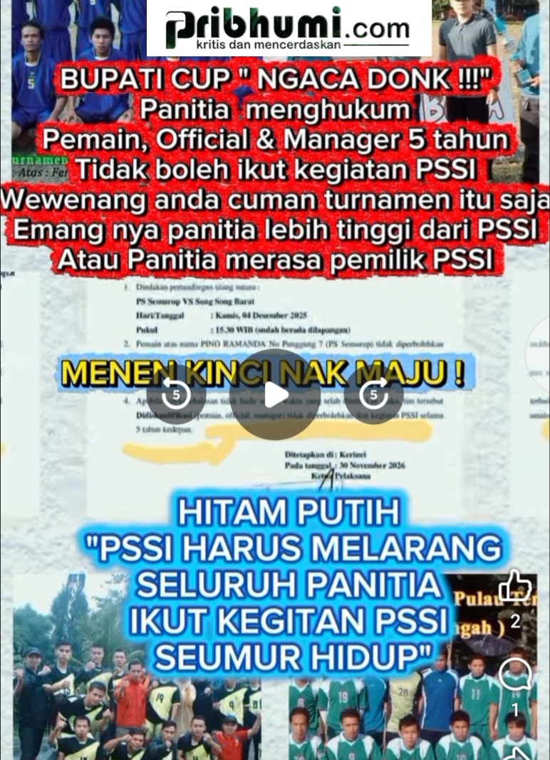 Kerinci, Pribhumi.com — Polemik menyelimuti pelaksanaan Turnamen Bupati Cup Kerinci 2025 setelah keputusan panitia yang dinilai berlebihan terkait pemberian sanksi kepada PS Semurup beserta pemain, official, dan manajernya. Sebuah keputusan tertulis panitia menyebutkan bahwa beberapa personel PS Semurup dijatuhi larangan mengikuti kegiatan yang berhubungan dengan PSSI selama lima tahun, memicu reaksi keras dari kalangan sepak bola lokal maupun publik.