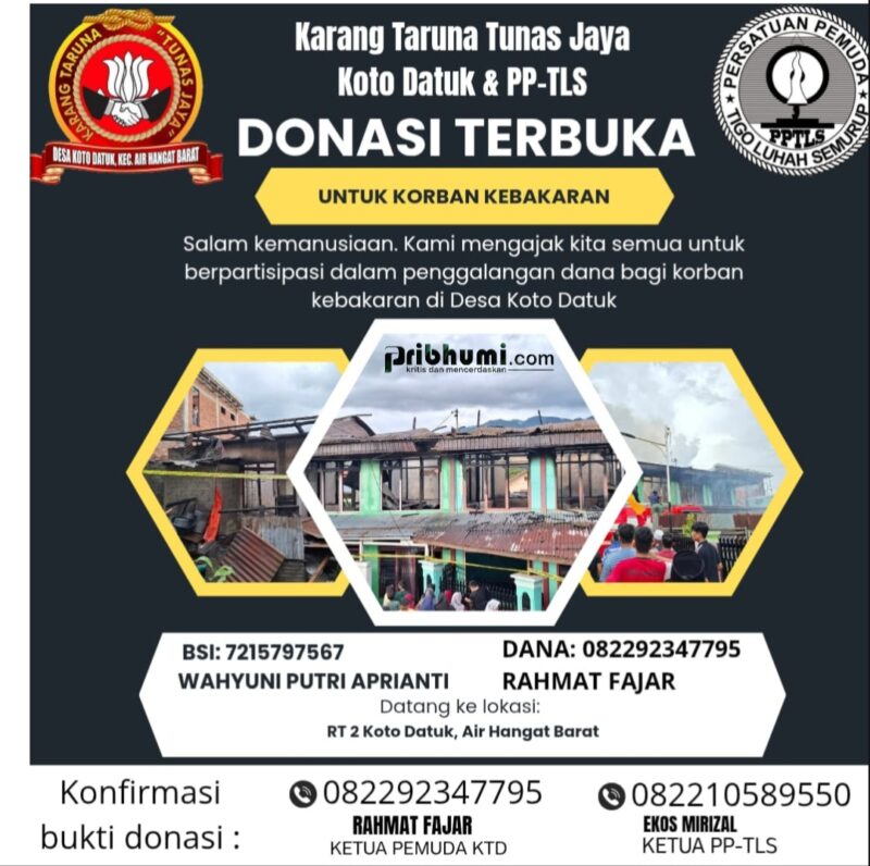 Ketua Pemuda Koto Datuk, Rahmat Fajar, bersama Ketua PP-TLS, Ekos Mirizal, mengajak seluruh lapisan masyarakat untuk turut berpartisipasi memberikan bantuan terbaik mereka. “Salam kemanusiaan. Kami mengajak kita semua untuk berpartisipasi dalam penggalangan dana bagi saudara-saudara kita yang tertimpa musibah di Desa Koto Datuk,” Ajak nya.