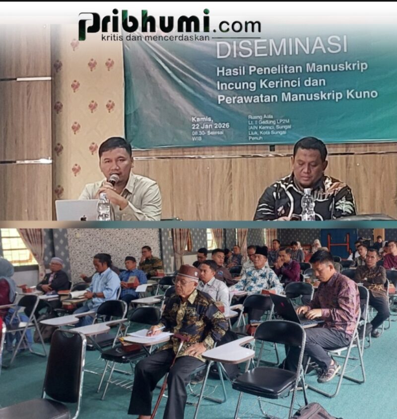Sungai Penuh, Pribhumi.com — Institut Agama Islam Negeri (IAIN) Kerinci menggelar kegiatan Diseminasi Hasil Penelitian Manuskrip Incung dan Perawatan Manuskrip Kuno pada Kamis (22/1/2026) di Aula LPPM IAIN Kerinci, Desa Sumur Gedang, Kecamatan Pesisir Bukit, Kota Sungai Penuh. Kegiatan ini menjadi forum strategis untuk memperkenalkan temuan terbaru sekaligus meningkatkan kesadaran masyarakat terhadap pentingnya pelestarian manuskrip kuno Kerinci.