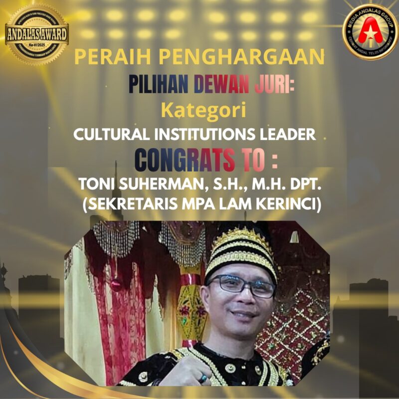 Kerinci, Pribhumi.com — Kiprah Toni Suherman, S.H., M.H. Dpt., dalam dunia kebudayaan kembali mendapat pengakuan di tingkat regional. Tokoh muda yang menjabat sebagai Sekretaris Majelis Permusyawaratan Adat (MPA) Lembaga Adat Melayu (LAM) Kerinci ini sukses meraih Andalas Award Ke-VI Tahun 2025, sebuah penghargaan bergengsi yang diberikan oleh Media Andalas Group.