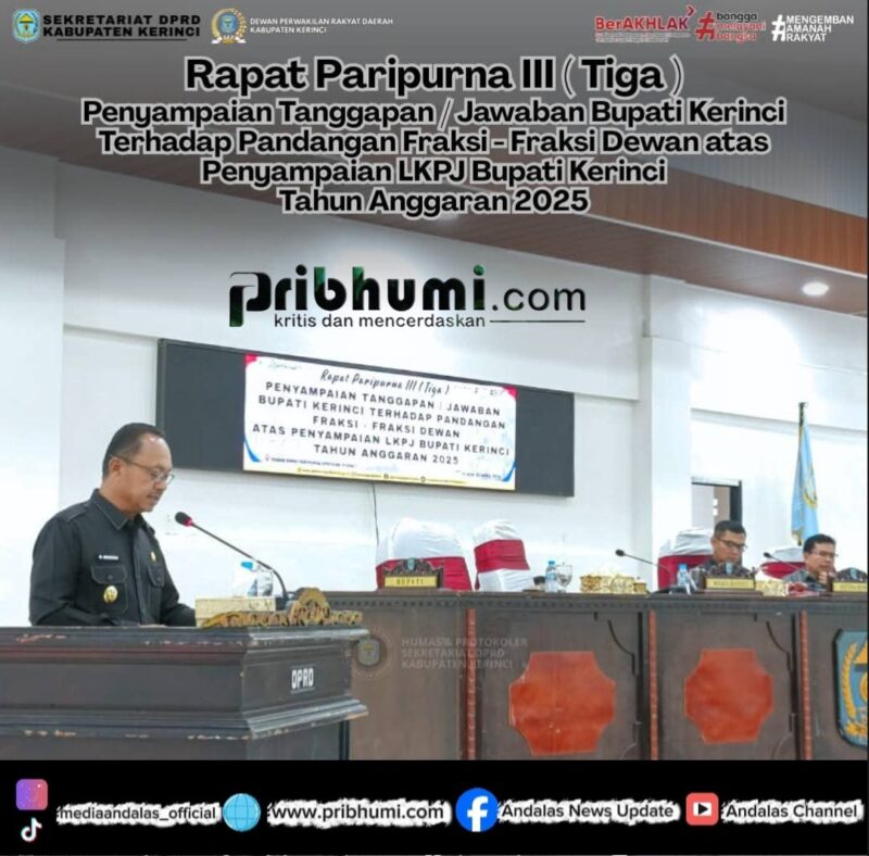 KERINCI, Pribhumi.com – Pemerintah Kabupaten Kerinci melalui Wakil Bupati Kerinci, H. Murison, menyampaikan tanggapan resmi atas pandangan umum fraksi-fraksi DPRD Kabupaten Kerinci terhadap Laporan Keterangan Pertanggungjawaban (LKPJ) Bupati Kerinci Tahun Anggaran 2025, dalam rapat yang digelar Selasa (7/4/2026).