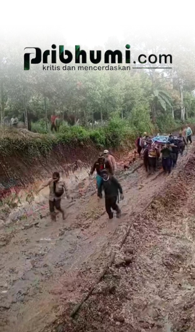 Puluhan warga tampak bergiliran mengangkat tandu melewati medan berat berupa jalan berbatu, berlumpur, dan licin. Perjalanan itu membutuhkan tenaga ekstra dan waktu berjam-jam, menciptakan pemandangan yang menggugah rasa iba sekaligus kemarahan publik terhadap buruknya kondisi infrastruktur daerah tersebut.