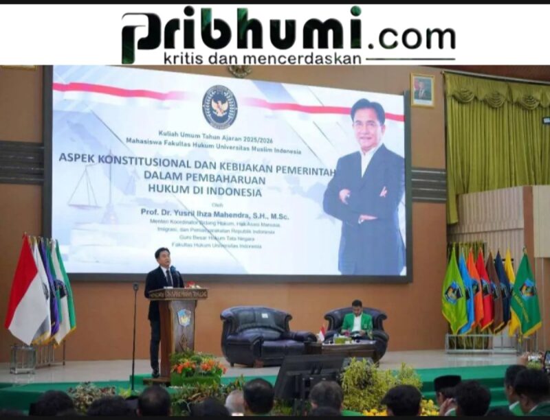 Makassar, Pribhumi.com — Menteri Koordinator Bidang Hukum, Hak Asasi Manusia, Imigrasi, dan Pemasyarakatan (Menko Kumham Imipas) RI, Yusril Ihza Mahendra, menyerukan pentingnya reformasi hukum yang berpijak pada prinsip-prinsip konstitusi di tengah perubahan zaman yang semakin cepat. Hal itu disampaikannya saat memberikan kuliah umum di Universitas Muslim Indonesia (UMI) Makassar, Selasa.